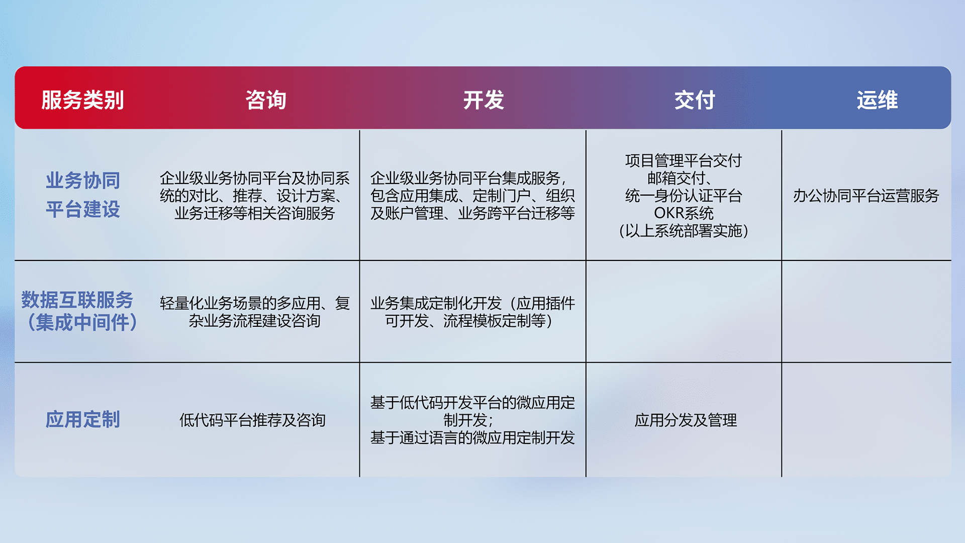 针对钉钉、、、、企微、、、、IDaas等平台级产品提供产品的规划、、方案、、、交付、、、定制化开发等服务,,,,实现如统一协同办公、、、、智能客户服务、、、、混合会议管理、、、、智能数据查询、、、等业务场景,,,,实现数字化转型。。。。